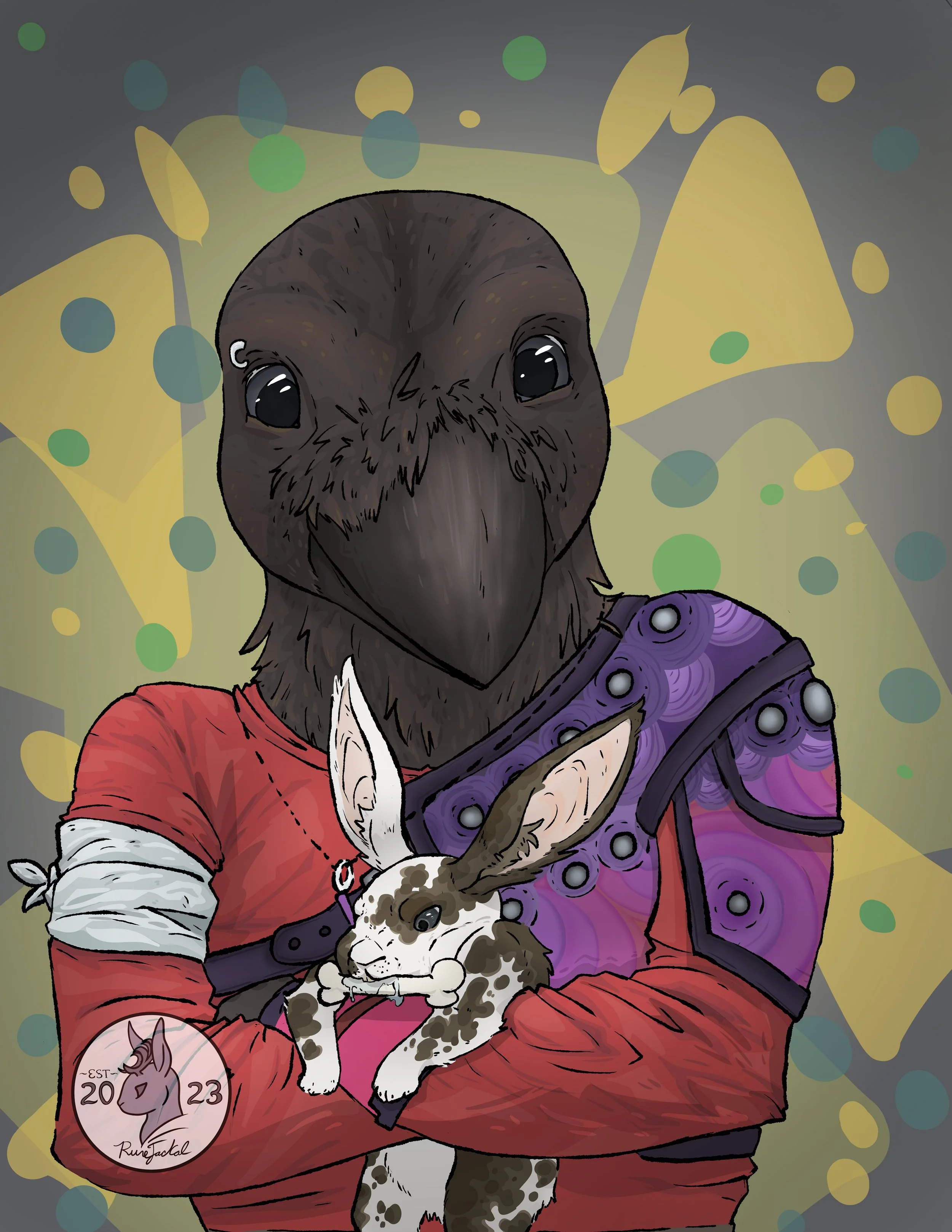 A somewhat-spontaneous drawing turned birthday gift for my friend Red of their character Chir! Chir is a rogue. Chir has a gun. It fires corks. We love Chir. We do not, however, love Knucklebones, as he fears nothing and would sell all of souls to a minor godling in a bundle deal for half of a human femur.